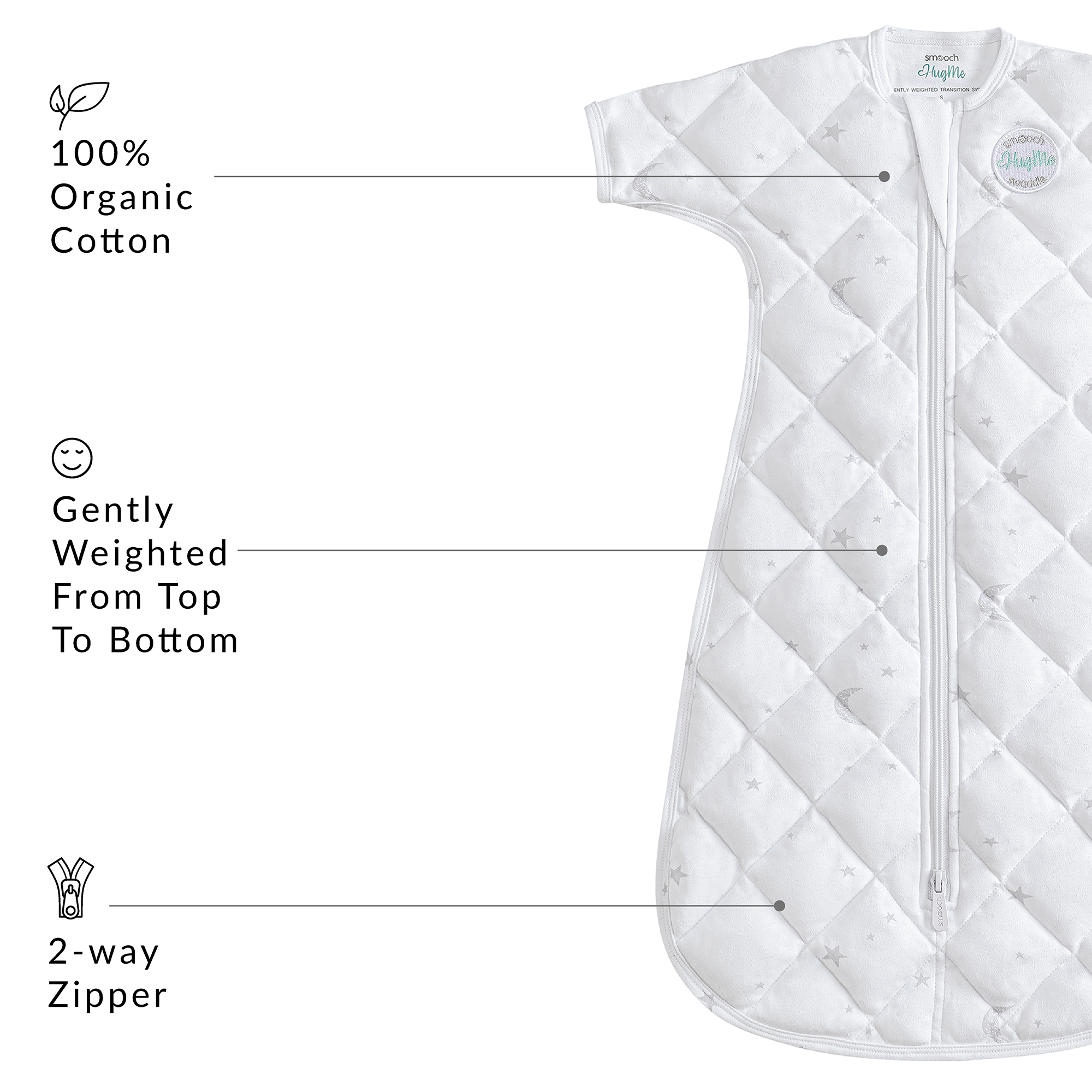 HugMe Gently Weighted Baby Sleep Sack - White Moon & Stars by Smooch Babies sold by Smooch Babies